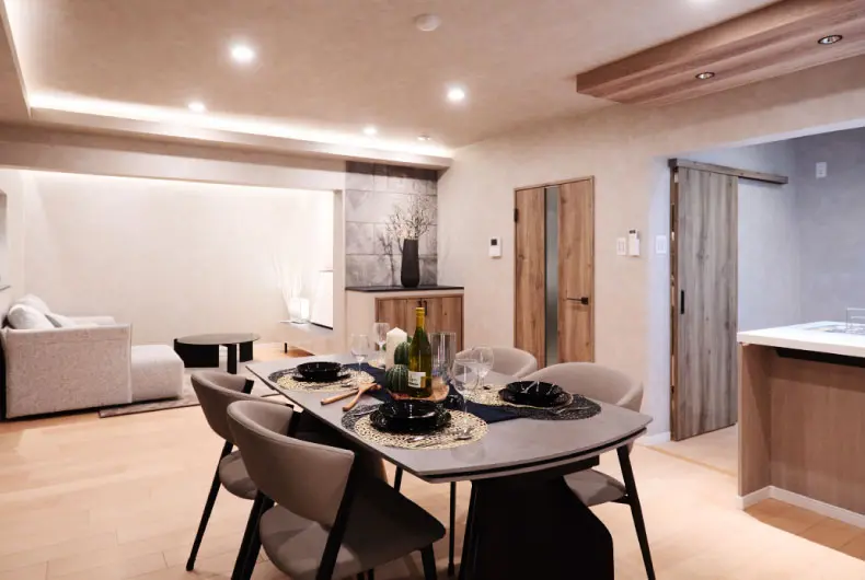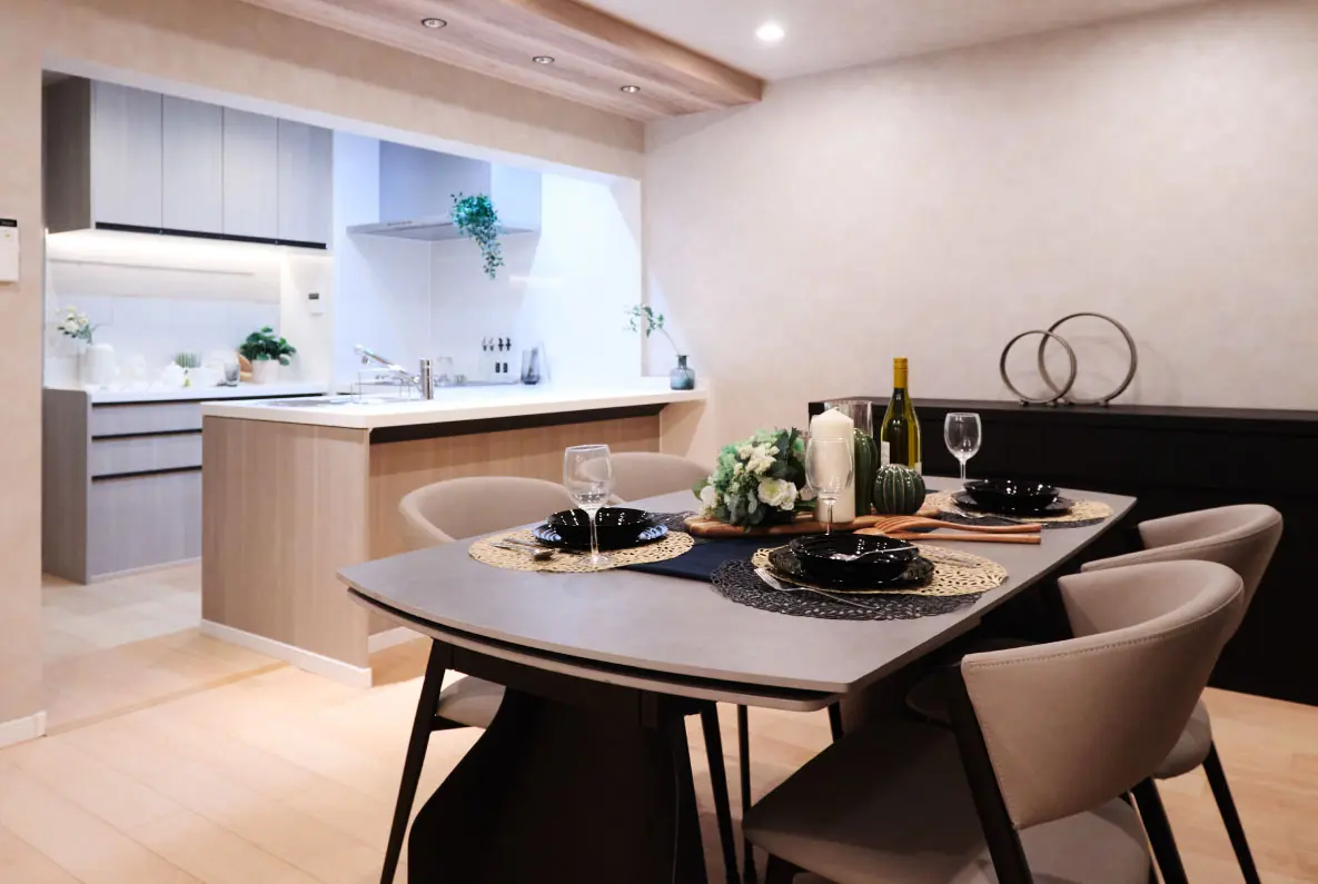 12帖超のダイニング。 拡張機能付きのテーブルでご来客やパーティーにも対応。 家族だけにとどまらない、広がる空間と繋がりを育んでいただけます。