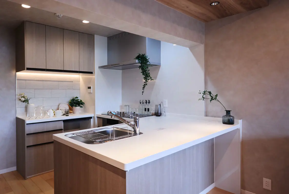 熱・汚れに強いワークトップ、自動風量調整のレンジフード、食洗機など充実の設備をスムーズな家事動線を実現するレイアウトに。