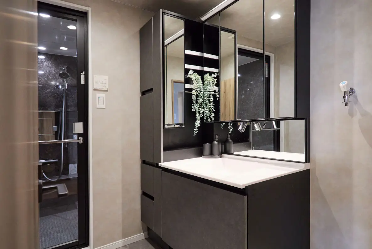 ブラックのベースとホワイトのボウルの対比が映える優雅な洗面空間。