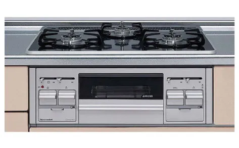 ハイパーガラスコートガスコンロ3口コンロ+両面焼きグリル付き。揚げもの温度調節、自動炊飯機能、煮込み機能、ダブル強火力など毎日のお料理が楽しくなる機能満載。