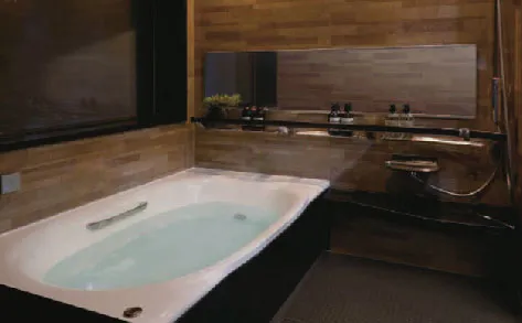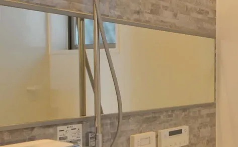 浴室ワイドミラー迫力のワイドミラーで浴室の高級感も一段アップ。お掃除ラクラクフレーム付き。