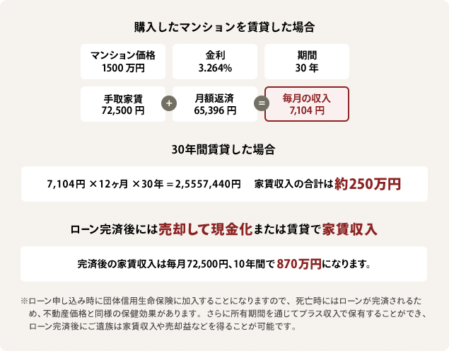 団体信用生命保険という生命保険があり所有者に万一(死亡や、高度障害で仕事継続不可能)の事が起こった場合にはローン残債が保険で弁済されて、ご家族には完済されたマンションが残ります。家賃収入はそのままを受け取ることができるという仕組みがあります。
