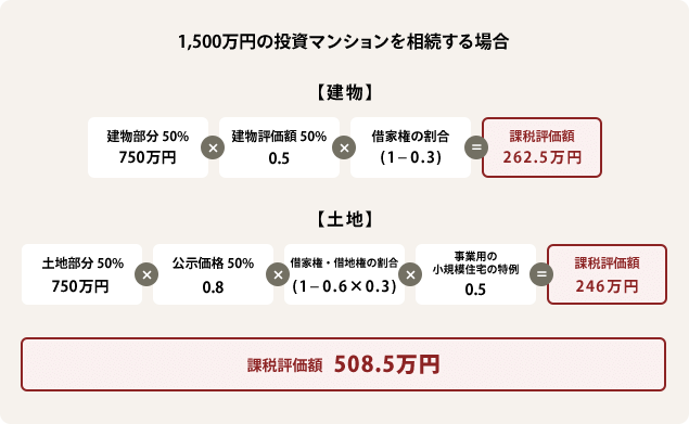 相続税は、現金及び有価証券に関し“時価金額”に対して課税されます。ですが不動産に関しては“評価金額”に対して課税されます。課税の対象となる土地の評価は実勢価格よりも低く、評価される公示価格の80%で建物の評価ではおおよそで50~60%となります。 また第三者に建物を貸している場合ですと、評価額に対して30%の控除を受けられますので、不動産投資は相続税対策に非常に有効です。